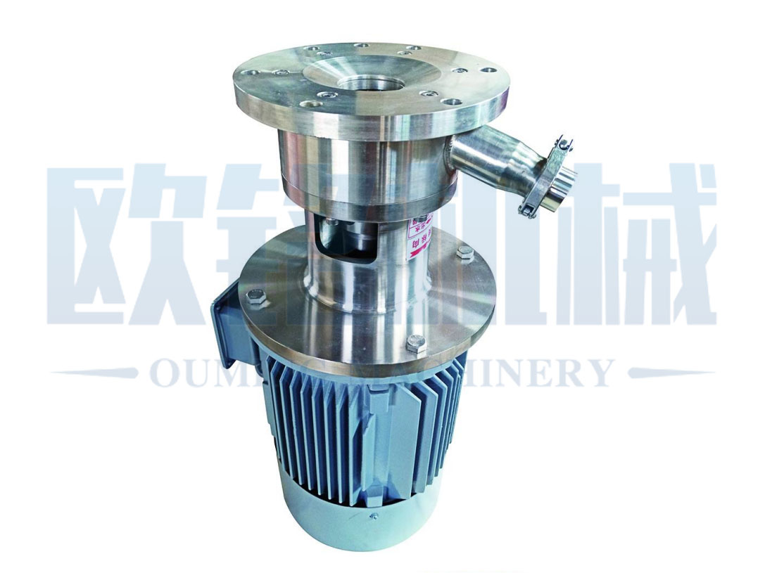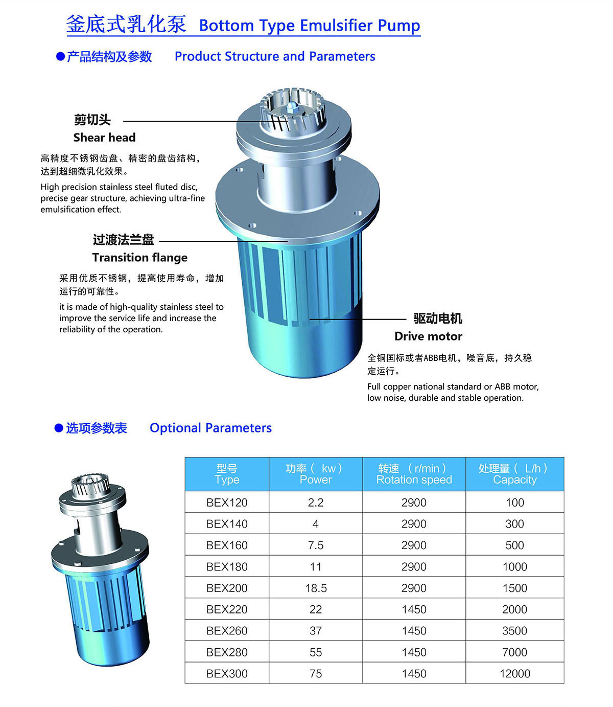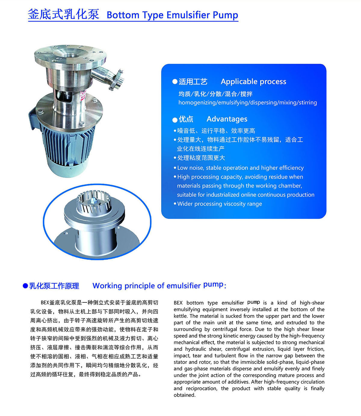 BEX釜底(di)(di)乳化(hua)泵是一種倒立式安(an)裝于釜底(di)(di)的(de)(de)(de)(de)高剪切(qie)乳化(hua)設備,物料從(cong)主(zhu)機上(shang)部與(yu)下(xia)部同時(shi)吸(xi)入,并向四周離心(xin)(xin)擠出,由于轉(zhuan)子(zi)高速旋轉(zhuan)所(suo)產(chan)生的(de)(de)(de)(de)高剪切(qie)線(xian)速度和(he)(he)高頻(pin)機械效應(ying)帶來的(de)(de)(de)(de)強(qiang)勁動能,使(shi)物料在定(ding)子(zi)和(he)(he)轉(zhuan)子(zi)狹(xia)窄的(de)(de)(de)(de)間隙中受到(dao)強(qiang)烈的(de)(de)(de)(de)機械及液(ye)力(li)剪切(qie)、離心(xin)(xin)擠壓、液(ye)層摩擦、撞擊撕裂和(he)(he)湍流等(deng)綜合作用,從(cong)而(er)使(shi)不(bu)相(xiang)溶的(de)(de)(de)(de)固相(xiang)、液(ye)相(xiang)、氣相(xiang)在相(xiang)應(ying)成熟(shu)工藝和(he)(he)適量添加劑的(de)(de)(de)(de)共同作用下(xia),瞬間均勻精細地分散(san)乳化(hua),經過高頻(pin)的(de)(de)(de)(de)循(xun)環往復,最終(zhong)得(de)到(dao)穩(wen)定(ding)品質(zhi)的(de)(de)(de)(de)產(chan)品。